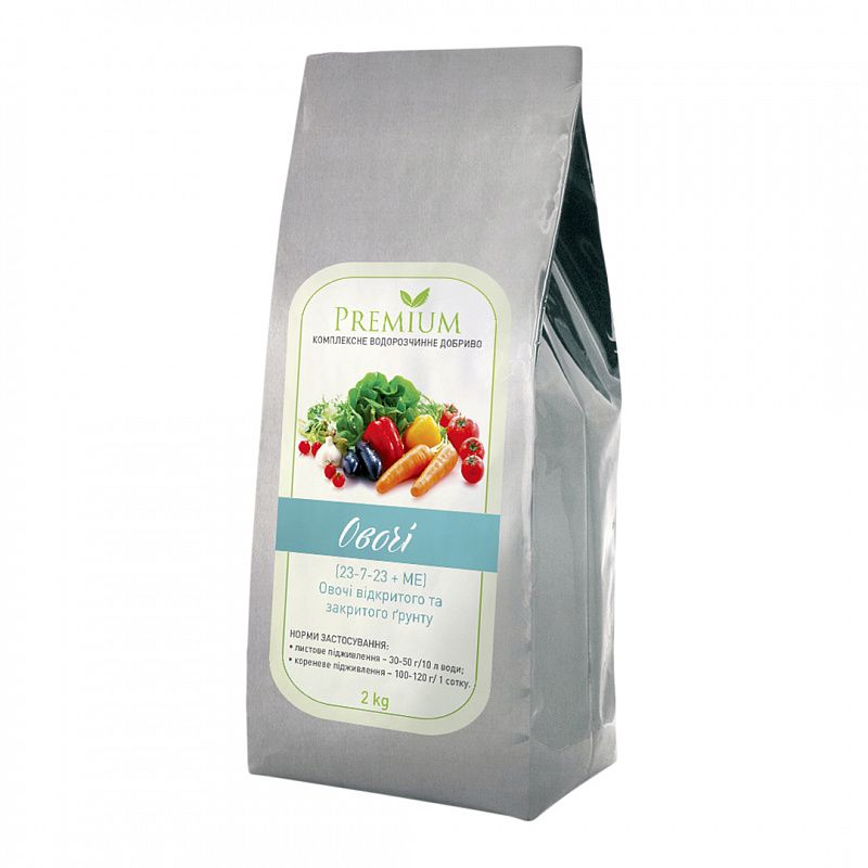 Добриво Преміум Овочі (Premium) 23-7-23+МЕ – комплексне водорозчинне добриво з мікроелементами у формі халатів, призначене для кореневого та позакореневого підживлення всіх овочевих рослин у відкритому та закритому ґрунті.