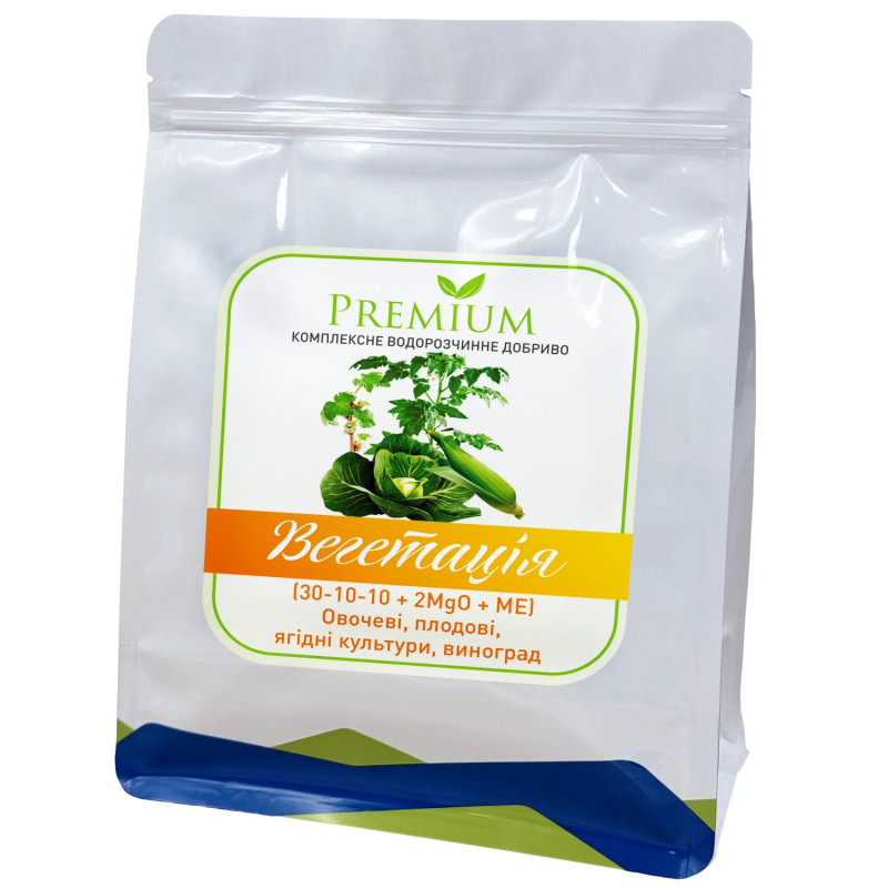 Добриво Преміум Вегетація (Premium) 30-10-10+2 MgO+МЕ – комплексне водорозчинне добриво з мікроелементами у формі хелатів для кореневого та позакореневого підживлення.