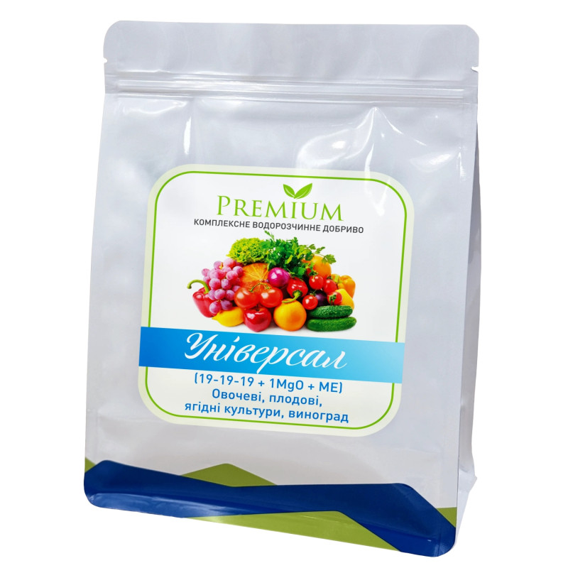 Добриво Преміум Універсал (Premium) 19-19-19 + 1MgO + МЕ – комплексне водорозчинне добриво з мікроелементами у формі хелатів для кореневого та позакореневого підживлення плодів, овочів, ягід та винограду в період вегетативного росту.