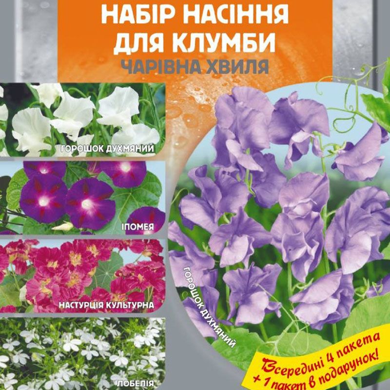 Набір насіння квітів для клумб Чарівна хвиля 4 + 1 – набір, який додає у ваш сад білих, рожевих і бузкових квітів.