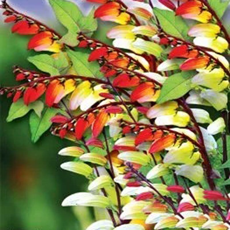 Міна (кучерява ліана) лопатева Іспанський Прапор – надзвичайно ефектна однорічна ліана з потужним червонуватим кучерявим стеблом і оригінальними колосоподібними суцвіттями довжиною 15-20 см яскраво-червоного, оранжевого, лимонно-жовтого, кремово-білого кольору.
