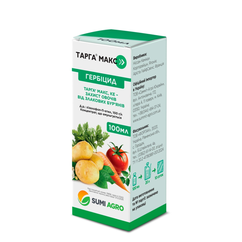 Гербіцид Тарга Макс високоефективний проти злакових бур’янів, і в той же час безпечний для наступних овочевих культур: буряки, морква, капуста, цибуля, часник, кавун, диня, огірки, перець, баклажани, шпинат, селера, салат, редиска, а також використовується у садах, виноградниках та ягідниках.