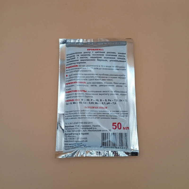 Позакореневе оброблення – 1 пакет (50 мл) розчинити в 10 л води.