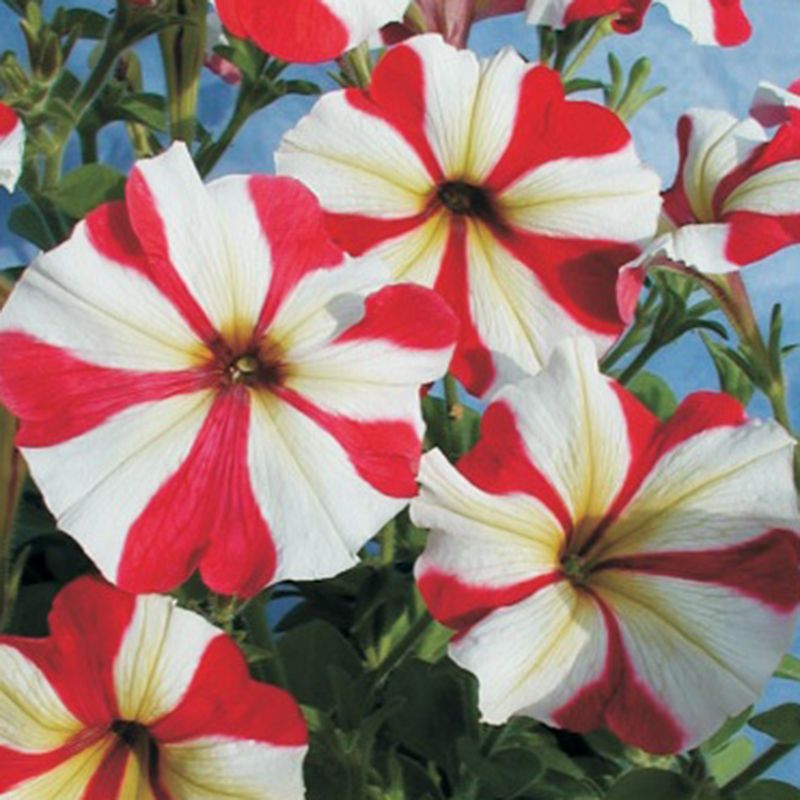 Петунія мультифлора Генрієтта F1 червоно-біла зірка – стійкий до несприятливих погодних умов гібрид.