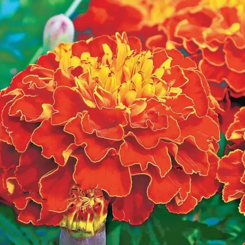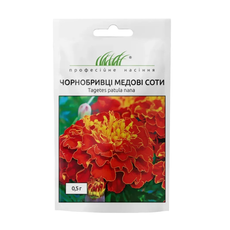 Чорнобривці розлогі Медові соти (Tagetes patula nana double Honeycomb) – один з найпоширеніших однорічників висотою 25-30 см, з махровими двокольоровими суцвіттями.