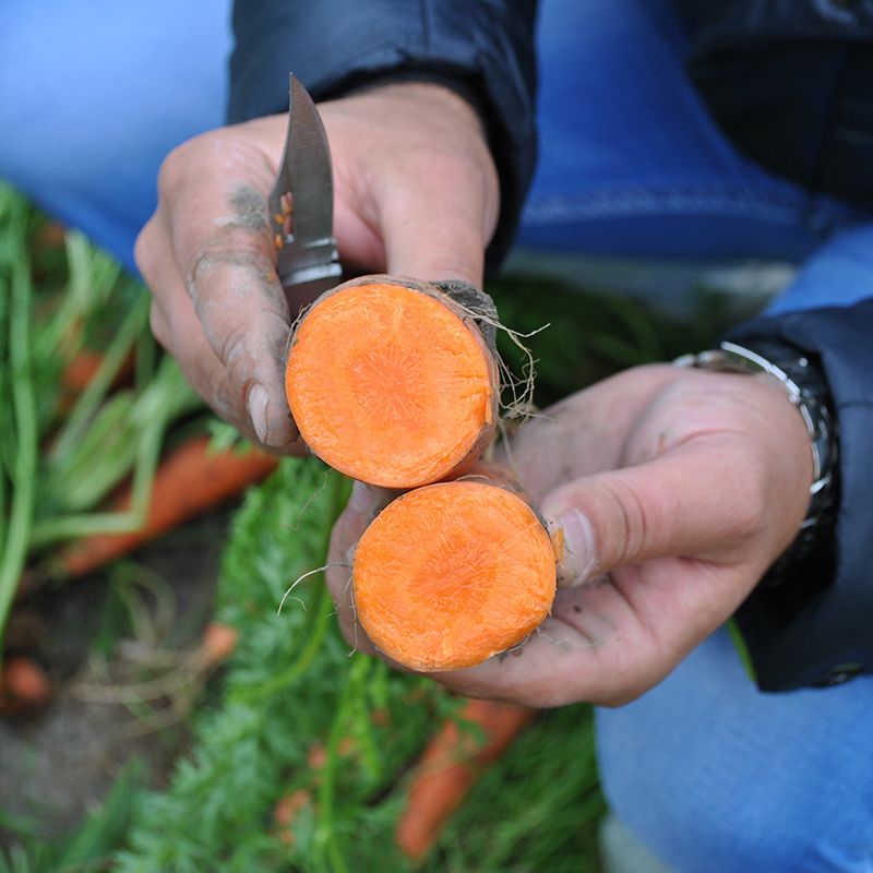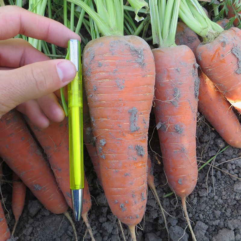 Характеристика плодів – Гладкі дуже вирівняні коренеплоди, неперевершений насичений колір, однорідна внутрішня структура. Довжина – 17-18 см. Ширина плеча – 4-4,5 см. Дуже смачний та солодкий.