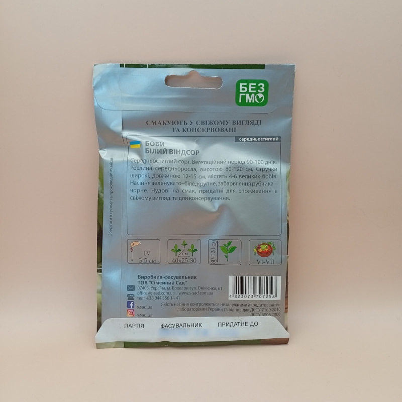 Характеристики плода – Насіння зеленувато-біле, крупне, забарвлення рубчика – чорне. Боби чудові на смак.