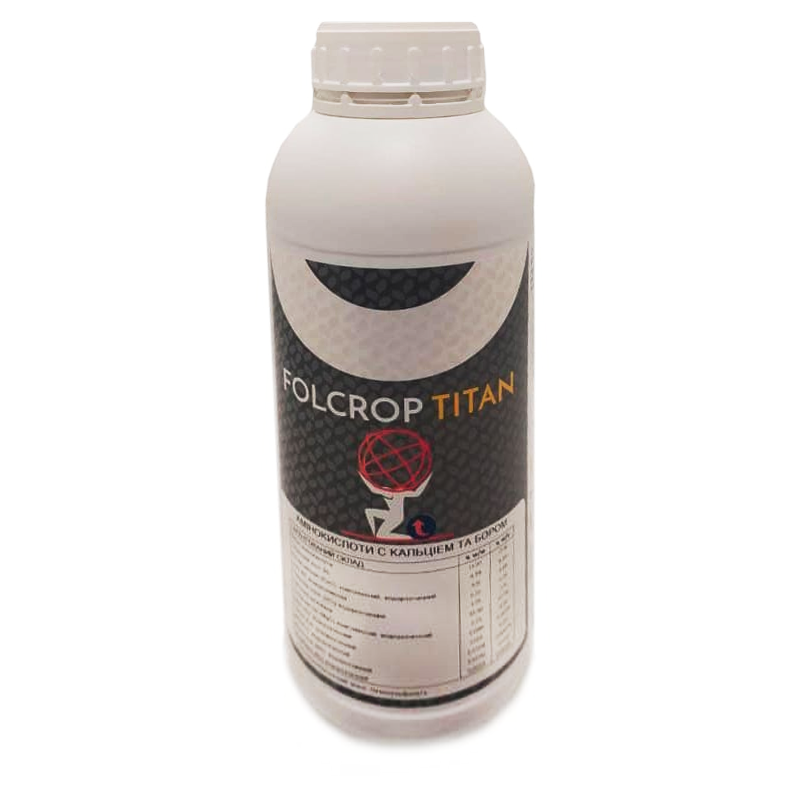 Folcrop Titan має великий склад. Зокрема, в нього входить азот – 6,0%, оксид кальцію – 4,09%, бор – 0,26%, тріоскид сірки – 2,31%, органічна рідина – 47,39% та вільні амінокислоти в обсязі 17, 16%. рН 5,4.
