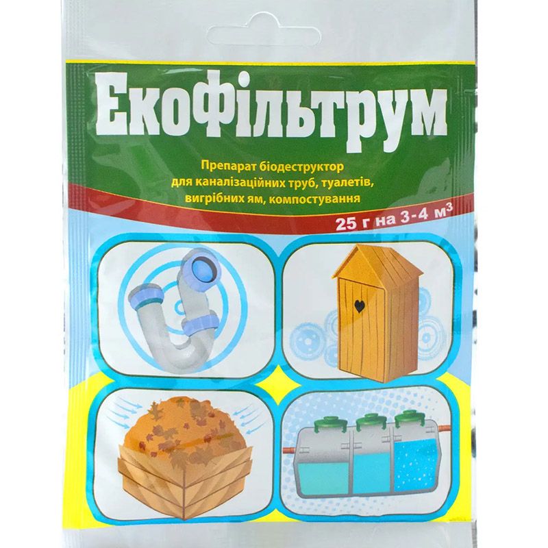 Екофільтрум для вигрібних ям – це суміш мікроорганізмів і ферментів, що має ефект прискореної переробки органічних відходів (фекалій, харчових і рослинних відходів) у вигрібних ямах, септиках, вуличних туалетах, каналізаційних трубах, а також при компостуванні.