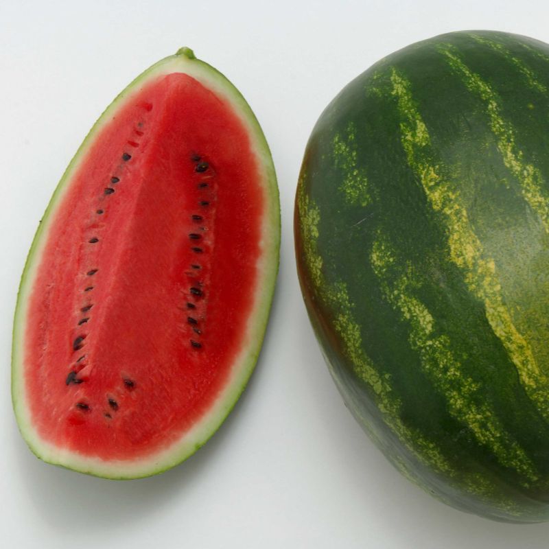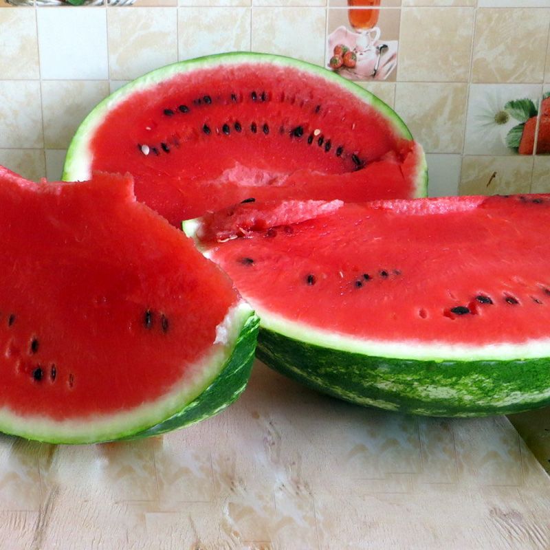 Характеристика плодів – Плід вагою 10-12 кг, з соковитою смачною м’якоттю, яскраво-червоного кольору і високим вмістом цукру (Брикс – 11-12%). Плоди покриті восковим нальотом, який захищає від опіків. Форма плоду – округло-овальна.