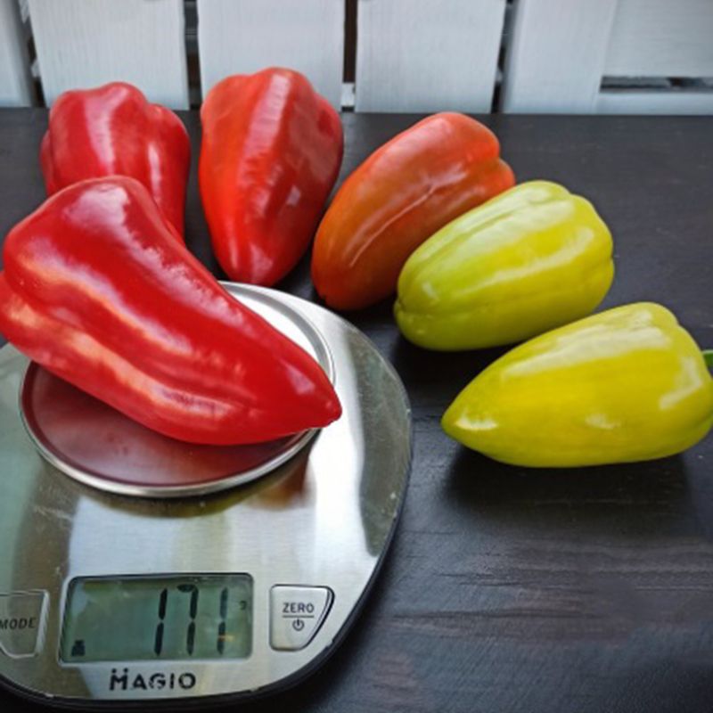 Характеристика плодів – Плоди конічної форми, вагою 150-180 г, розмір 7-8х11 см. Якісний плід з товстою стінкою – 6,5 мм. Плоди у технічній стиглості світло-зеленого кольору, у біологічній – насичено-червоного кольору.