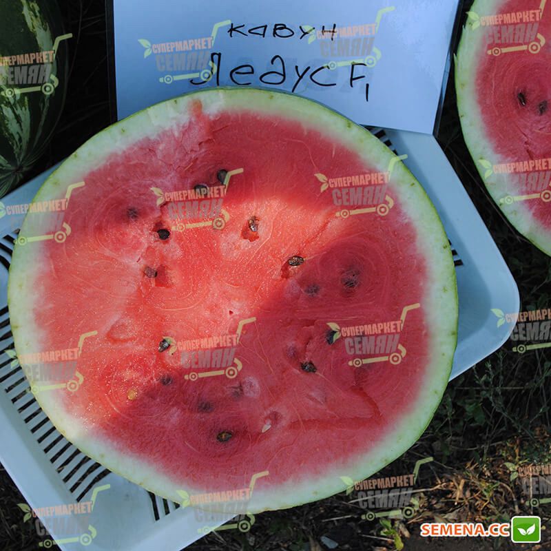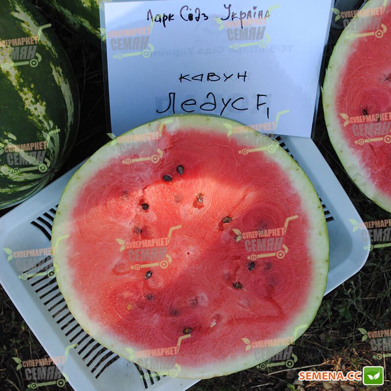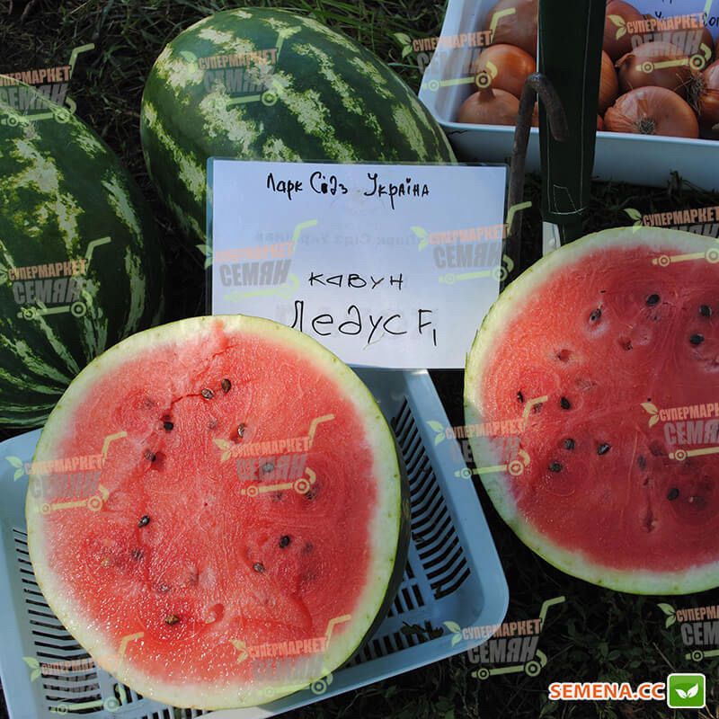 Як Ви можете подивитися фотографії вище, плоди довгасті, шкірка світло-зеленого кольору з тонкими темно-зеленими смужками, в середньому один плід важить близько 11 кг.