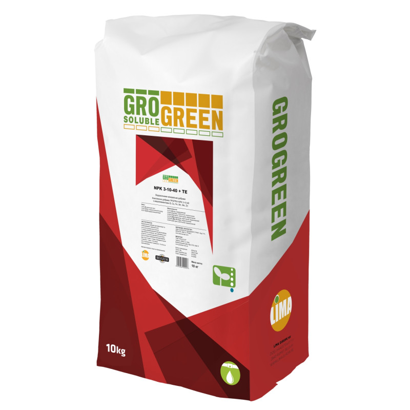 Добриво НПК (NPK) 3-10-40+TE водорозчинне GroGreen – добриво, призначене для овочів, фруктів, квітів, технічних і зернових культур.