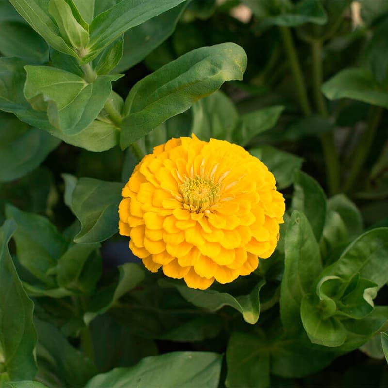 Цинія Дейліа жовта (Zinnia elegans Dahlia yellow) – високоросла однорічна рослина з яскраво-жовтими великими квітами з безліччю пелюсток.