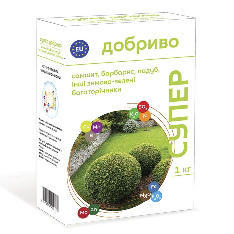 Самшит, барбарис, кизильник, магонія, падуб (гостролист), бруслина (бересклет), інші зимово-зелені багаторічники | 40 г добрива змішати з 10 літрами субстрату та додати в посадкову яму | 30-40 г на молоду рослину 40-50 г на старші кущі |