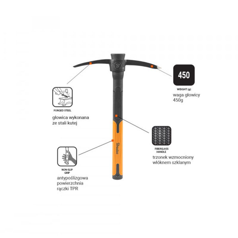 Кирка FIBERGLASS 450 г, KT-KF1045 – кирка із загартованої кованої інструментальної сталі.