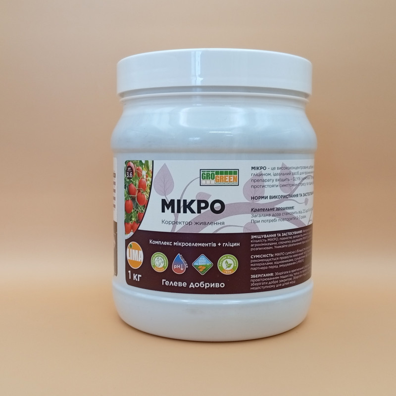MICRO-висококонцентроване добриво, яке містить мікронутрієнти в комплексі з гліцином, що призводить до високого поглинання з листя та швидкого переходу в рослині. Наявність амінокислот допомагає культурі протистояти симптомам стресу, підвищує енергію та ріст. Стимулює вироблення хлорофілу, збільшує фотосинтез та загальний ріст рослин.