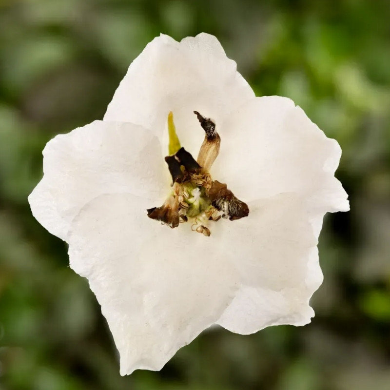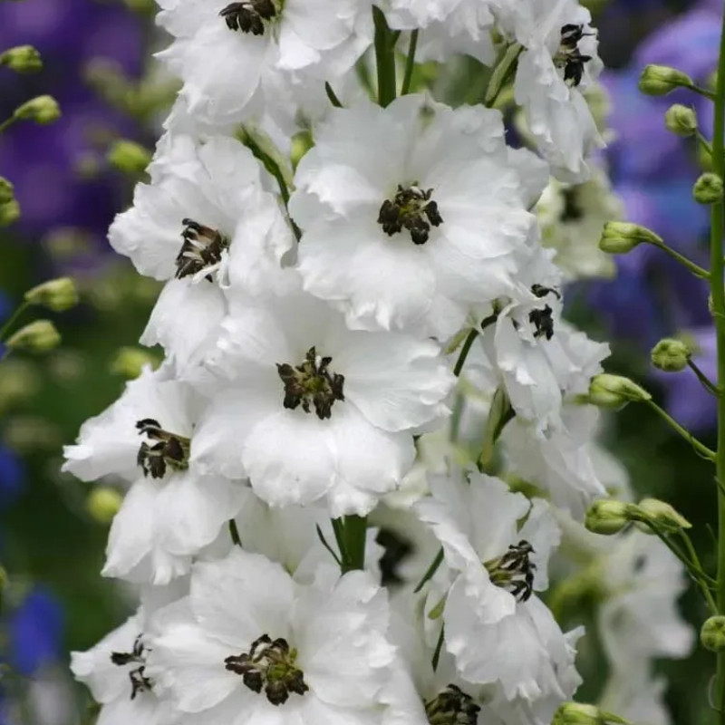 Дельфініум Дельфіна білий з чорним вічком (Delphinium elatum Delphina) – компактна низькоросла серія.