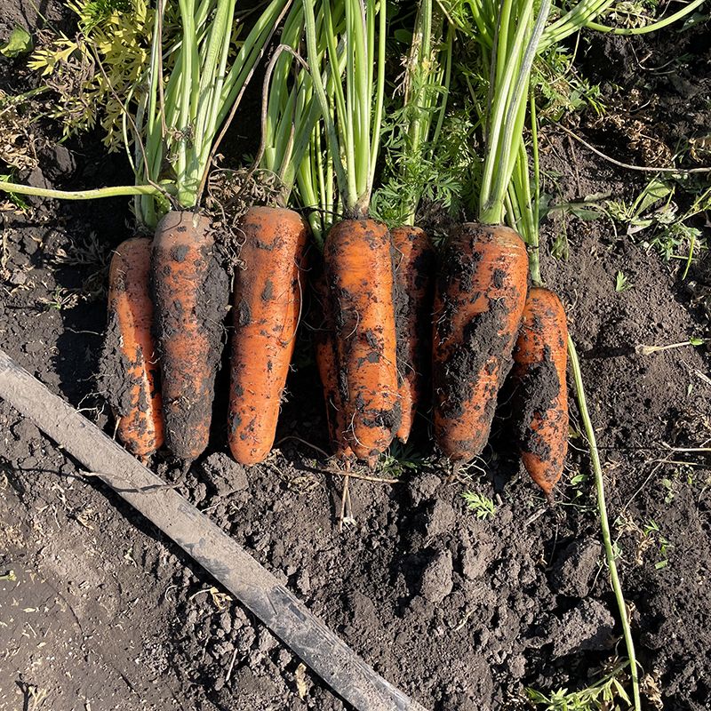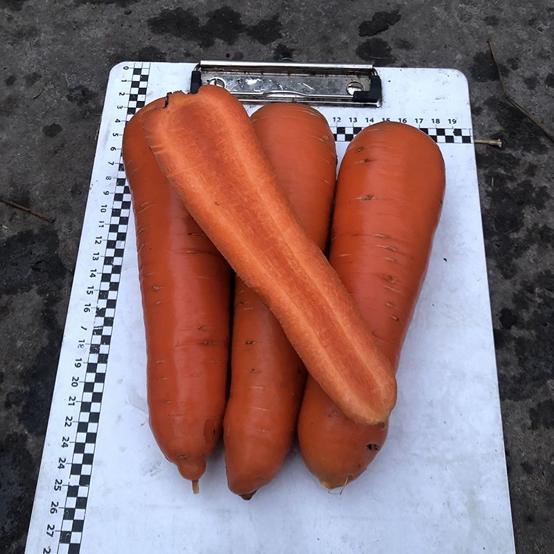 Характеристика плодів – Коренеплоди насиченого помаранчевого кольору, вирівняні, циліндричної форми, довжиною 18-20 см, стійкі до розтріскування.
