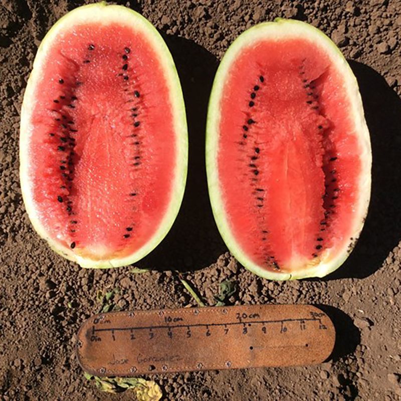 Характеристика плодів – Плоди овальні, смугасті, вагою 12-15 кг. Має привабливі темно-зелені смуги. Дуже смачний, з хрусткою текстурою і насичено-червоним кольором.