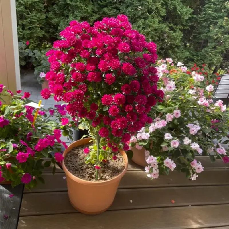 Кожна рослина представляє собою окремий вишуканий букет. Формує міцний кущ висотою 50-60 см з великою кількістю (30-40) бічних пагонів, вкритих махровими мініатюрними квітами, діаметром 2,5-3 см. Пелюстки розташовуються в кілька шарів і пропорційно зменшуються від зовнішньої частини квітки до внутрішньої. Цвітіння тривале з серпня до жовтня.