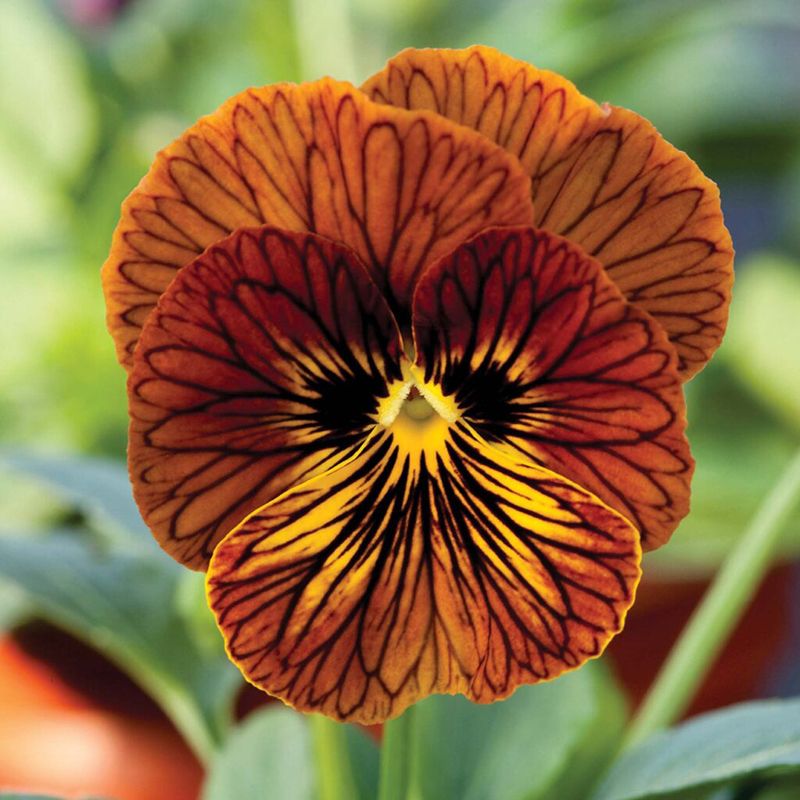 Віола Тайгер Ред F1 (Viola cornuta Tiger Eye Red F1) – ранній гібрид нової генерації з яскравими смугастими квітками.