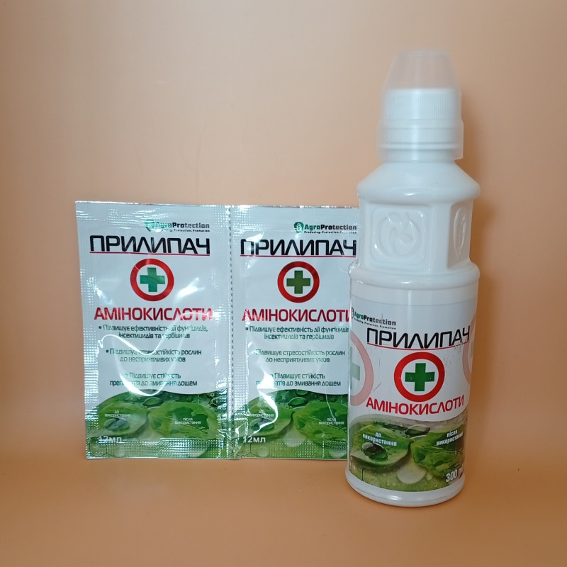 Прилипач+Амінокислоти – поверхнево-активна речовина (ПАР), призначена для покращення покриття, вмісту та проникнення робочих розчинів засобів захисту рослин та добрив, що підвищує їх ефективність.