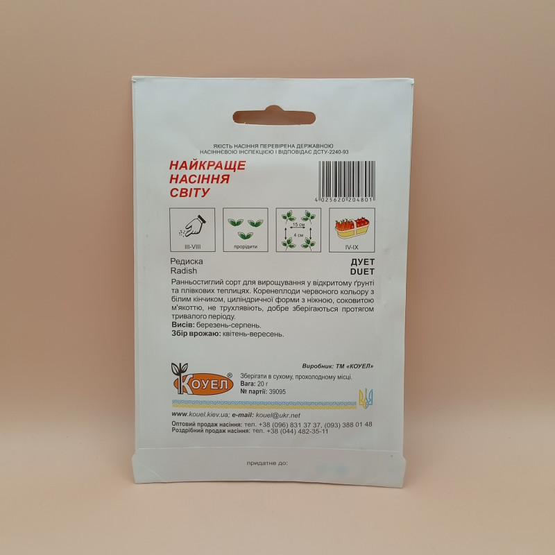 Дует - сорт редису. Рослина є ранньою (до 25 днів). Віддає перевагу росту у відкритих грунтах / плівкових теплицях. Плід циліндричний, червоний з білим на кінці, вагою до 30 гр. Рослина володіє ніжною, соковитою м'якоттю, що не трухлявіе і добре зберігається досить довгий час. Сорт відмінно росте на легкому живильному грунті. Найкраща температура для плоду - близько + 15-18 С.