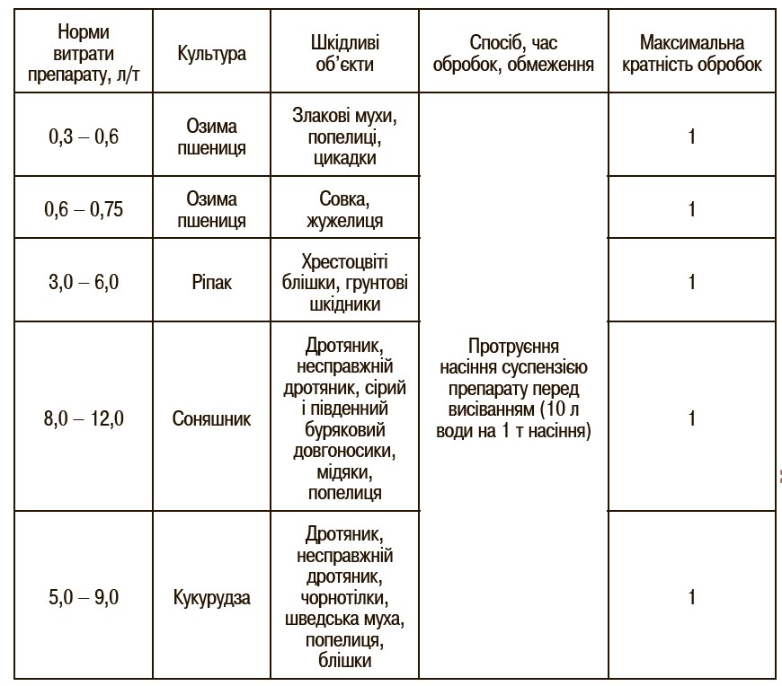 Призначення: Інсектицид системної дії для передпосівної обробки насіння сільськогосподарських культур.