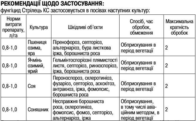 Призначення: Фунгіцид системної дії для захисту пшениці озимої та ярої, ячменю ярого та озимого, соняшника, сої від широкого спектру хвороб.