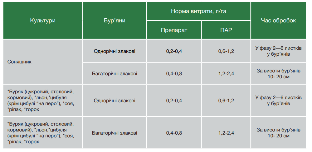 Мінімальні дози препарату застосовують при дотриманні оптимальних строків обробки, максимальні – при високій засміченості (понад 300 шт/м2) чи по перерослих бур’янах. З появою другої хвилі сходів бур’янів можливе дробне внесення по 0,2 л/га.
