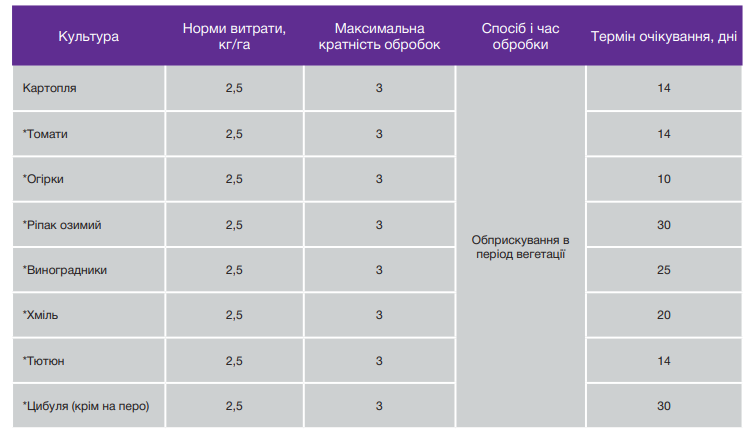 Важливо! Даний препарат сертифікований в Україні і його можна використовувати згідно з інструкцією. Вся інформація щодо застосування препарату взята з інструкції виробника. Якщо у вас є питання щодо застосування у вашій конкретній ситуації, рекомендуємо проконсультуватися з нашим агрономом Людмилою Валеріївною, +38(099)648-41-39 +38(098)953-00-24