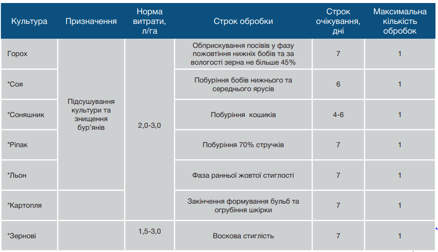 - є одним із швидкодіючих з десикантів, дозволяє приступити до збирання вже через 5–7 днів після обприскування;