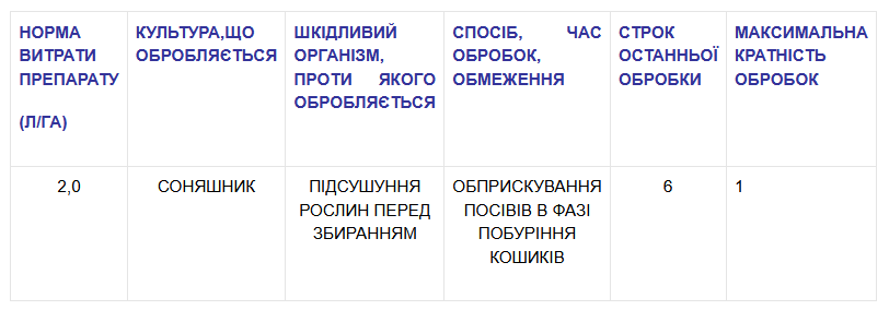 Призначення: Десикант для підсушування рослин соняшнику перед збиранням.