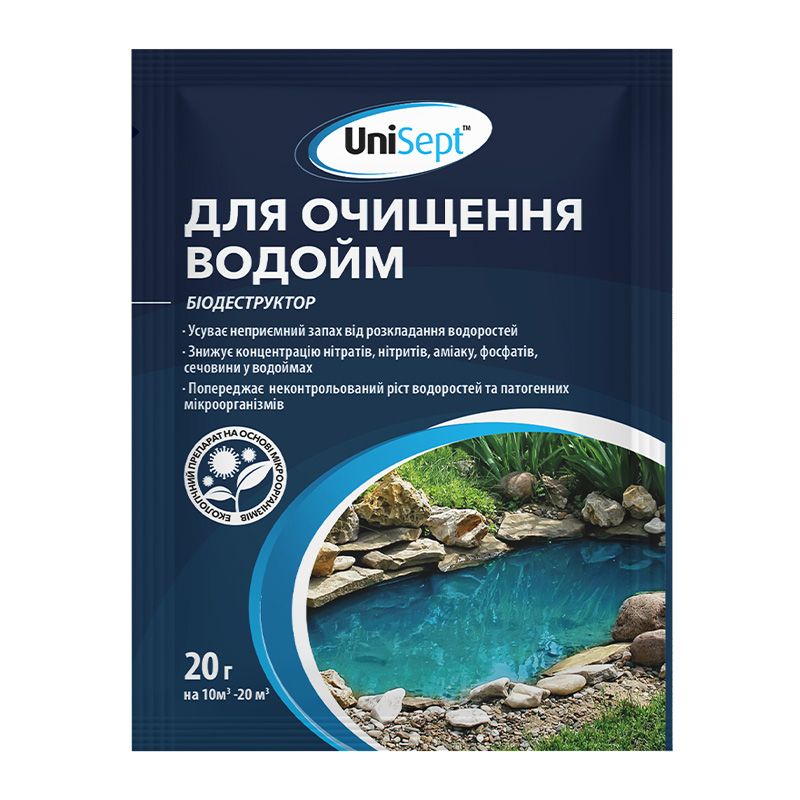 UniSept — багатокомпонентний біопрепарат, спеціально розроблений для очищення ставків, озер, акваріумів та басейнів від органічних забруднень. Завдяки активним мікроорганізмам та природним ферментам, UniSept ефективно усуває неприємні запахи, знижує концентрацію шкідливих речовин та запобігає неконтрольованому росту водоростей.