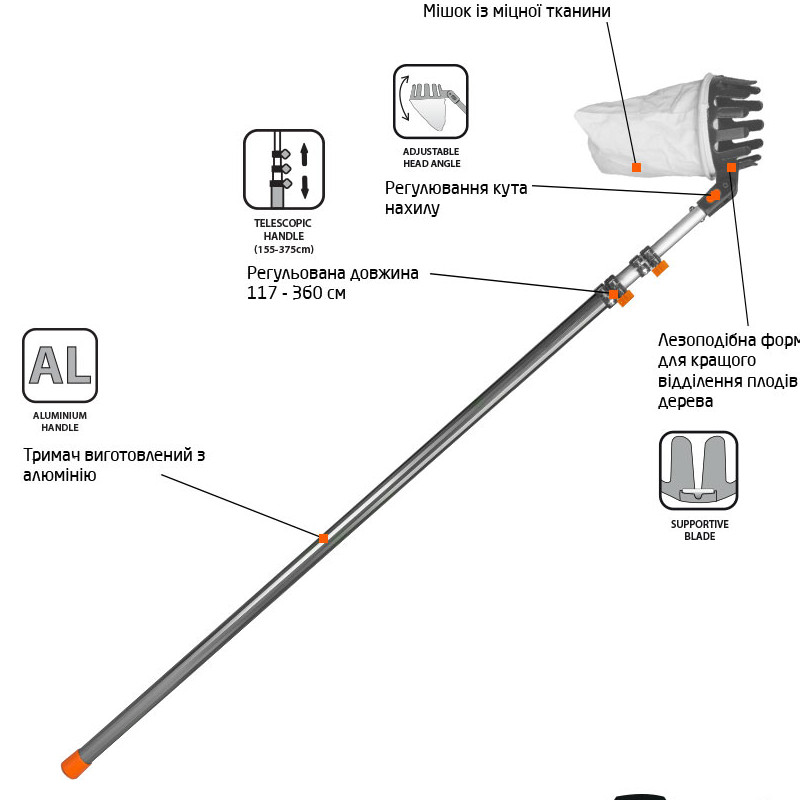Плодознімач на телескопічному держаку V-SERIES-P, KT-V1531-360 – зручне рішення для збирання фруктів без драбини.
