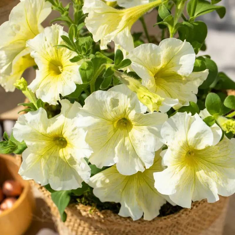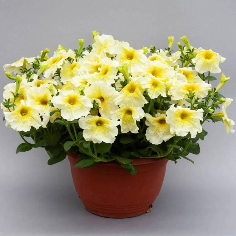 Петунія Призма F1 sunshine — сонячний гібрид із теплим жовтим відтінком, що випромінює радість та додає саду відчуття літа навіть у похмурі дні.