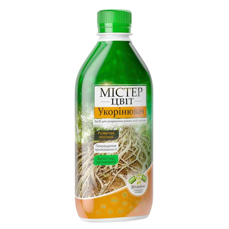 Добриво «Містер Цвіт» Укорінювач — спеціалізований комплексний засіб для стимуляції утворення кореневої системи у живців, розсади, саджанців, насіння та цибулин. Завдяки поєднанню макро- і мікроелементів, регуляторів росту, органічних кислот і фунгіцидної складової препарат підвищує приживаність посадкового матеріалу, активізує ріст коренів і забезпечує захист від загнивання на початкових етапах розвитку.
