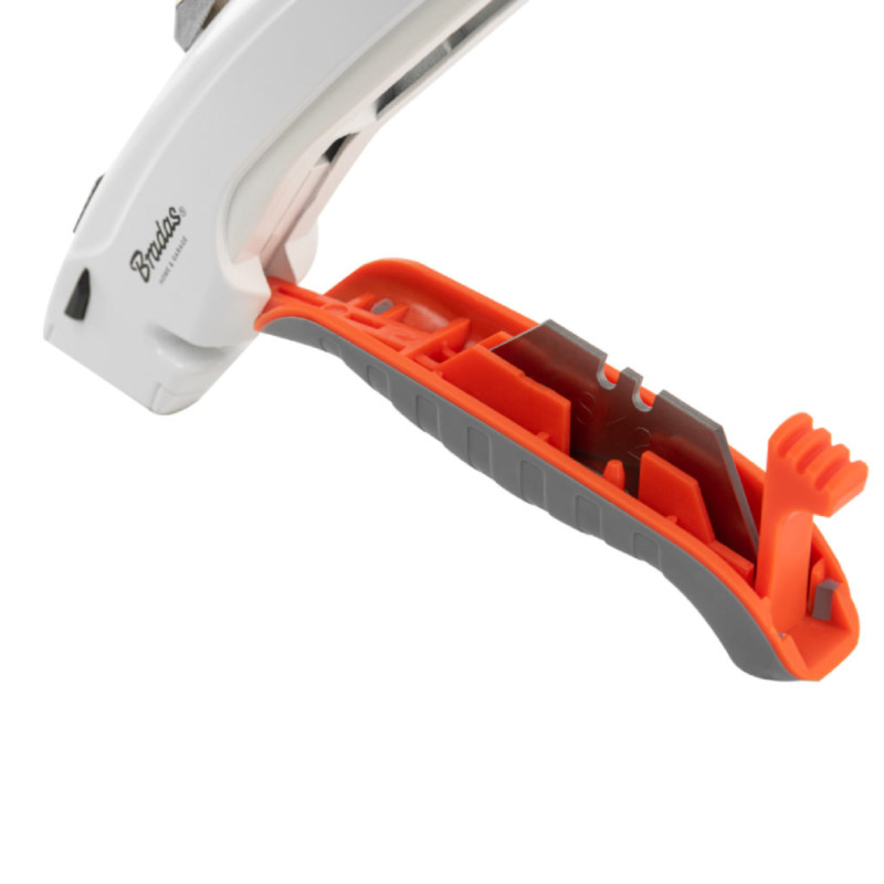 Оснащений самоблокувальним механізмом ковзання (клік-стоп), що дозволяє надійно фіксувати лезо в робочому положенні. Має додаткову функцію різання шнурів і ременів – зручно для аварійних ситуацій або роботи з текстильними матеріалами. У комплект входить магазин із запасними лезами (1 в ножі + 3 додаткові), що дозволяє швидко замінити лезо без зусиль.