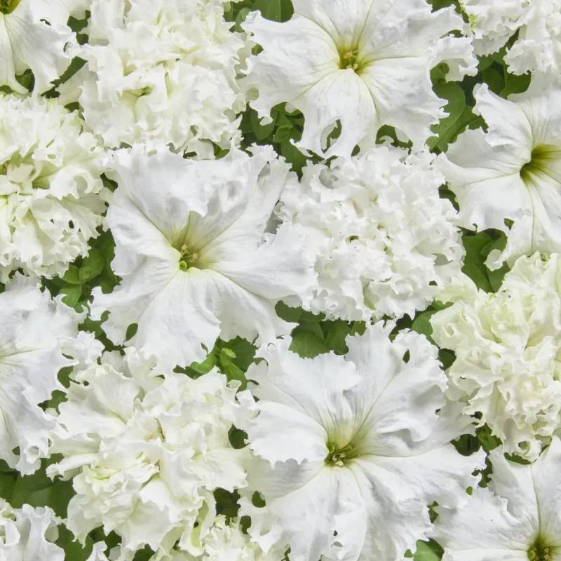 Серія Біла F1 належить до оригінальної бахромчастої колекції петуній і поєднує у собі 50% махрових та 50% простих квіток. Великі сніжно-білі пелюстки діаметром 6,5–7 см красиво контрастують із ніжною жовтою серединкою. Кущ компактний, добре розгалужений, висотою 35–40 см. Рослина вирізняється рясним та тривалим цвітінням, що зберігає декоративність упродовж усього сезону.