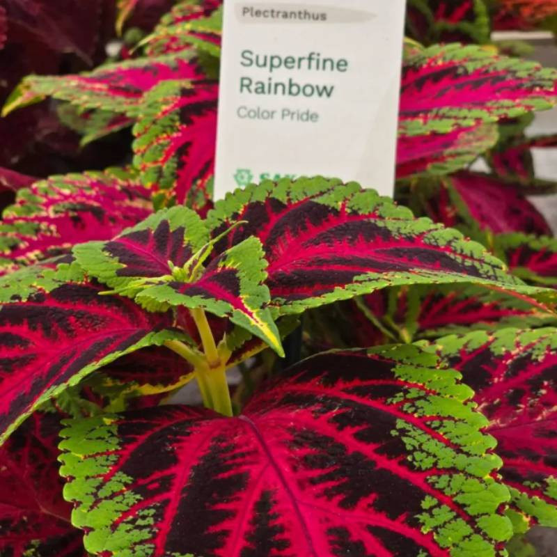 Колеус Суперфайн Рейнбоу Color Pride — це декоративна рослина середньої висоти з великим листям, яке поєднує яскраві контрастні відтінки, створюючи унікальний візерунок. Вирізняється гарним прикореневим розгалуженням і пізнім періодом цвітіння, що дозволяє довго зберігати декоративність.