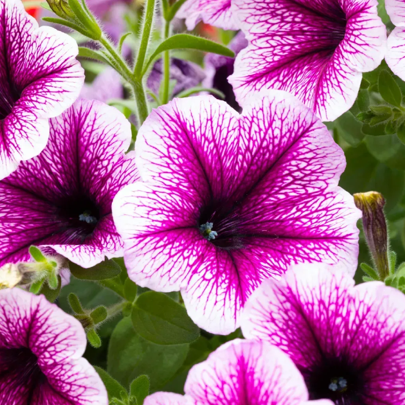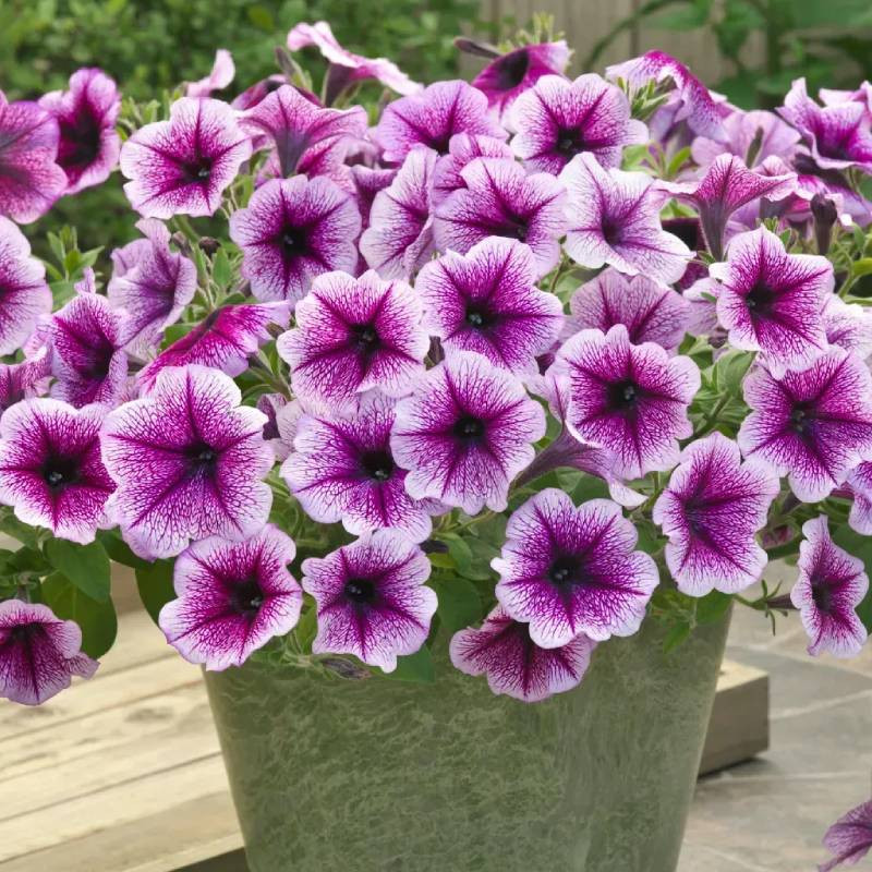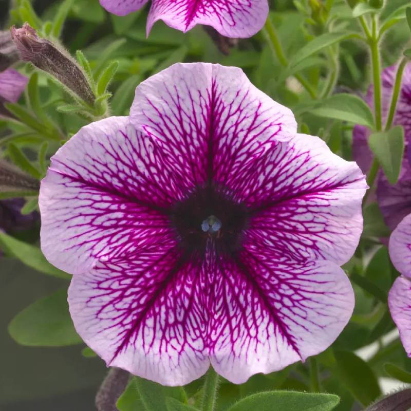 Петунія ампельна Опера Супрім F1 (Petunia hybrida Opera Supreme F1) колір Purple Vein – витончений гібрид із дивовижним поєднанням світло-фіолетових пелюсток, пронизаних контрастними пурпуровими жилками. Квітка виглядає особливо ефектно завдяки грі відтінків і легкому шовковистому блиску.