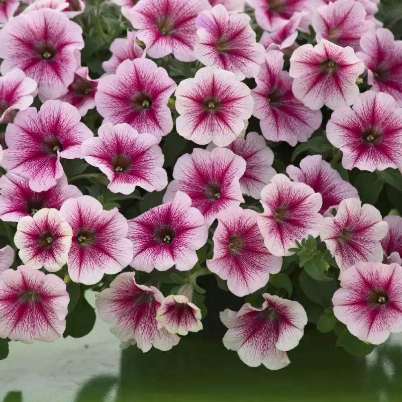Петунія ампельна Опера Супрім F1 (Petunia hybrida Opera Supreme F1) колір Raspberry Ice – яскравий гібрид із контрастним поєднанням малиново-рожевого краю та світлого серединного відтінку. Квітки виглядають неймовірно свіжо й святково, нагадуючи морозний малиновий десерт, що прикрашає будь-яку композицію.