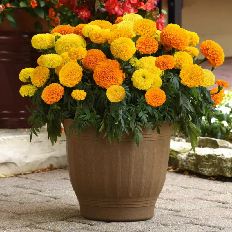 Квітки: Махрові або напівмахрові, діаметром 8–10 см, кулястої форми, щільні, з рівномірною структурою пелюсток, що нагадують хризантеми. Квітконоси міцні, добре тримають форму. Суміш насичених кольорів — чистий жовтий і помаранчевий (без градієнтів чи відтінків), що створює яскравий, контрастний акцент у саду. Квіти в міксі розподіляються випадково, забезпечуючи природну різноманітність. Колір стійкий, не вигорає на сонці. - Період цвітіння: Починається через 60–70 днів після посіву (зазвичай з кінця червня за посіву в березні–квітні) і триває до перших заморозків (вересень–жовтень в Україні). Рясне цвітіння забезпечує постійну декоративність куща.