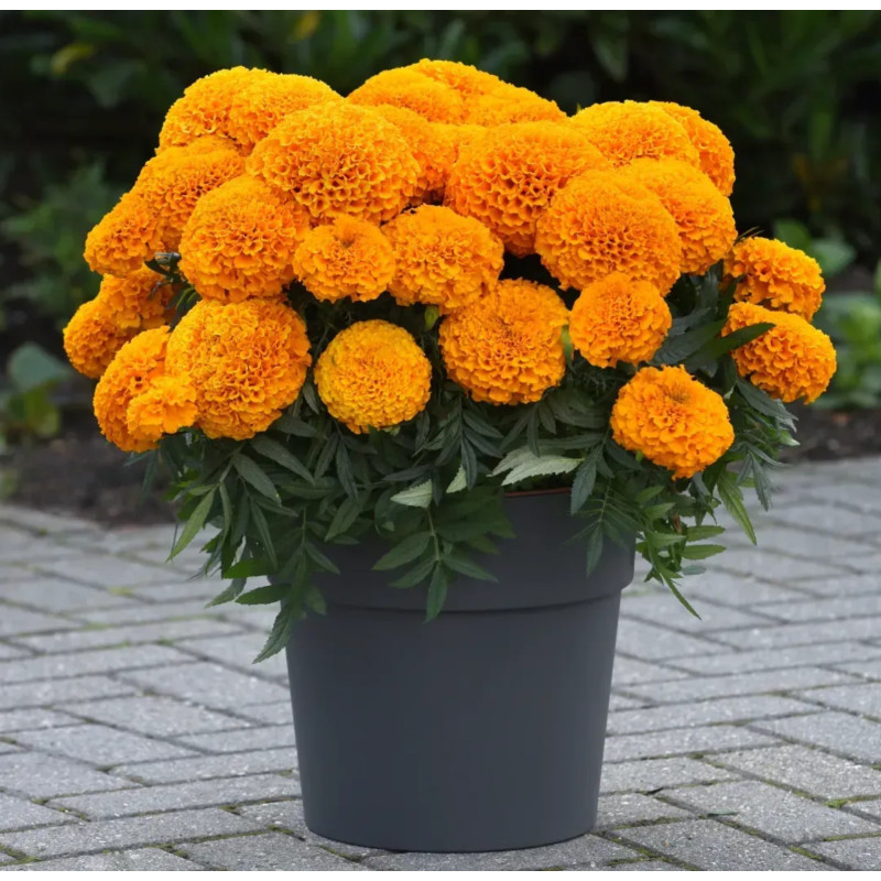 - Квітки: Махрові або напівмахрові, діаметром 8–10 см, кулястої форми, щільні, з рівномірною структурою пелюсток, що нагадують хризантеми. Квітконоси міцні, добре тримають форму. Забарвлення насичене, чистий помаранчевий колір (без градієнтів чи відтінків), що створює яскравий акцент у саду. Колір стійкий, не вигорає на сонці.