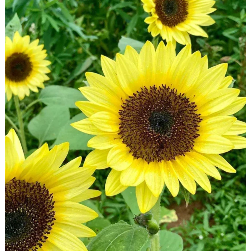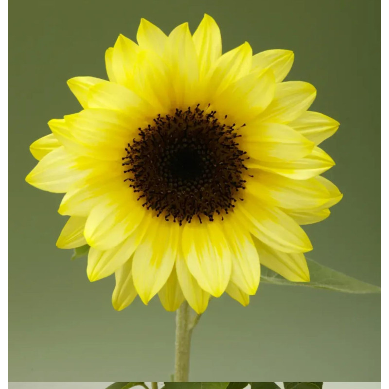 - Колір і форма: Унікальний двофарбовий ефект — пелюстки яскраво-жовті в основі, що переходять у ніжно-кремовий або лимонний відтінок на кінчиках, з насиченим темно-коричневим центром. Квітки спрямовані вгору, нагадують класичну форму соняшника, але з "попом" завдяки градієнту кольору.