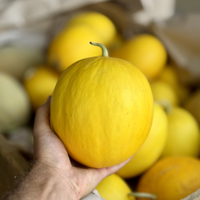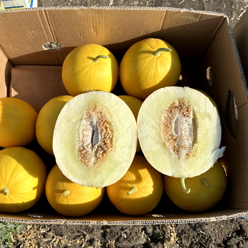 М'якоть білосніжна, дуже солодка, а зовнішній вигляд — яскраво-жовтий, гладкий, без сітки.