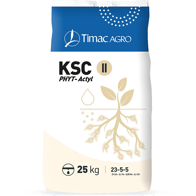 KSC PHYT-ACTYL II (КСЦ 2 Фіт-Актил 23-5-5) від Timac Agro — це водорозчинне органо-мінеральне добриво, розроблене для активації кореневої системи та підвищення ефективності засвоєння поживних речовин. Завдяки біокомплексу Phytactyl, цей продукт ідеально підходить для фертигації овочевих культур (як у відкритому, так і в закритому ґрунті), садів, виноградників та ягідників. Також його можна застосовувати для позакореневого підживлення зернових, особливо на початкових етапах росту та в періоди підвищеної потреби рослин у фосфорі.