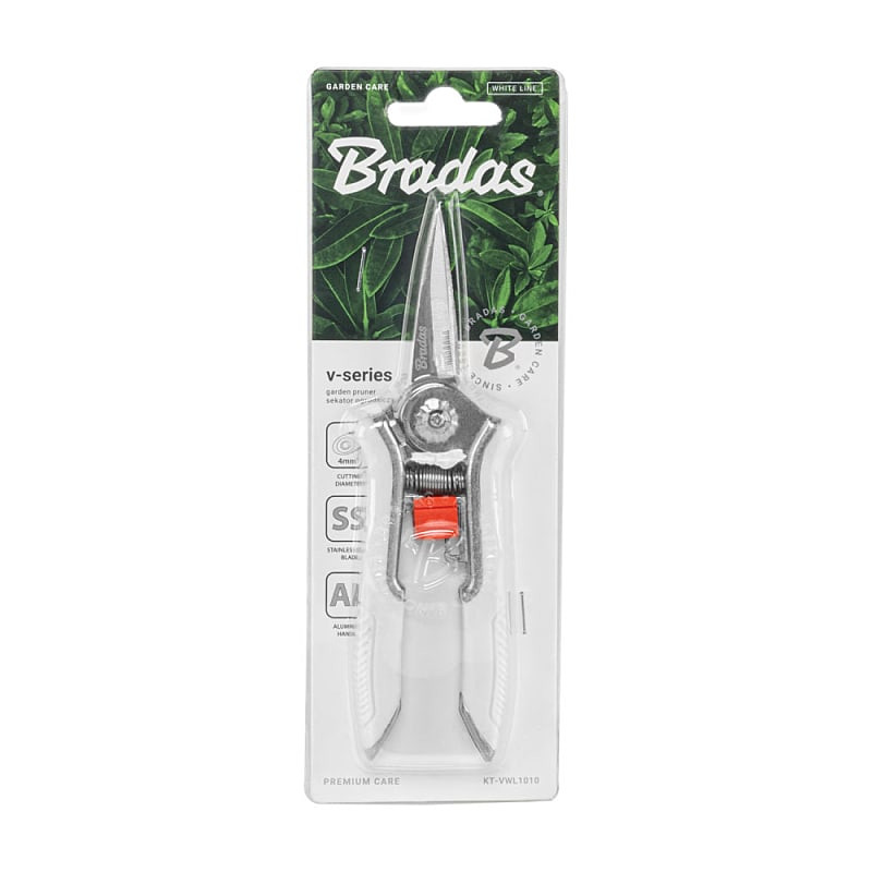 Цей садовий секатор V-SERIES з прямими лезами з нержавіючої сталі (модель SS KT-VWL1010 від Bradas) забезпечує точний і чистий зріз. Він ідеально підходить для обрізання молодих пагонів, квітів та формування акуратної крони рослин як на відкритій ділянці, так і в теплиці.