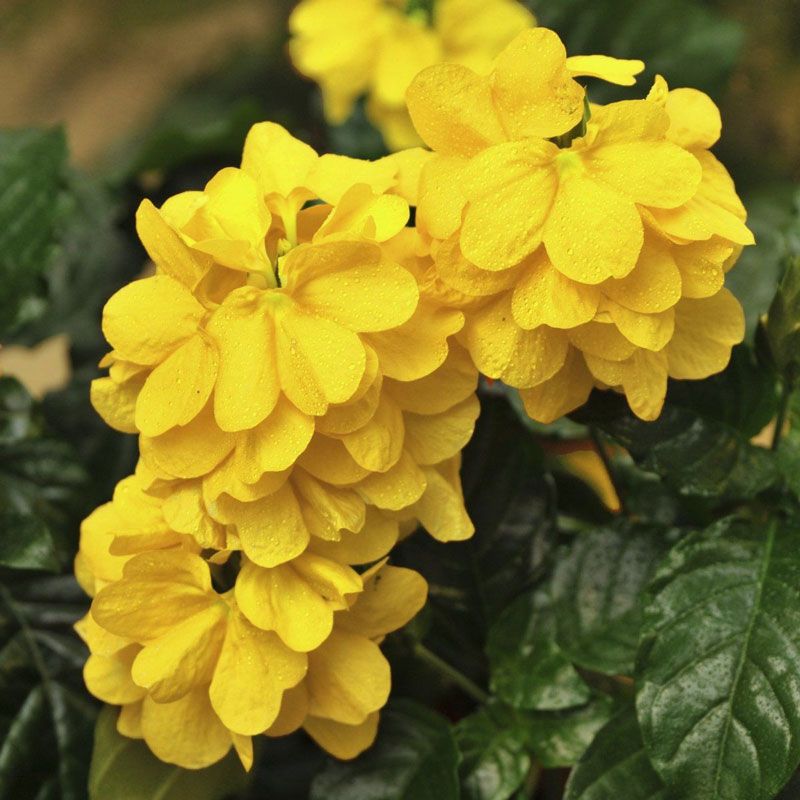 Квіти кроссандри Тропік жовтого забарвлення, 2-2,5 см у діаметрі, зібрані в щільні колосовидні суцвіття, довжиною до 10 см.
